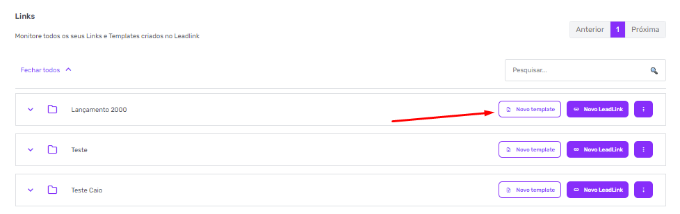Dentro das pastas, é possível utilizar um template, que é um conjunto de parametrizações pré-definidas com o intuito de facilitar a parametrização dos seus LeadLinks. Para criar um novo template, você deverá seguir os passos: