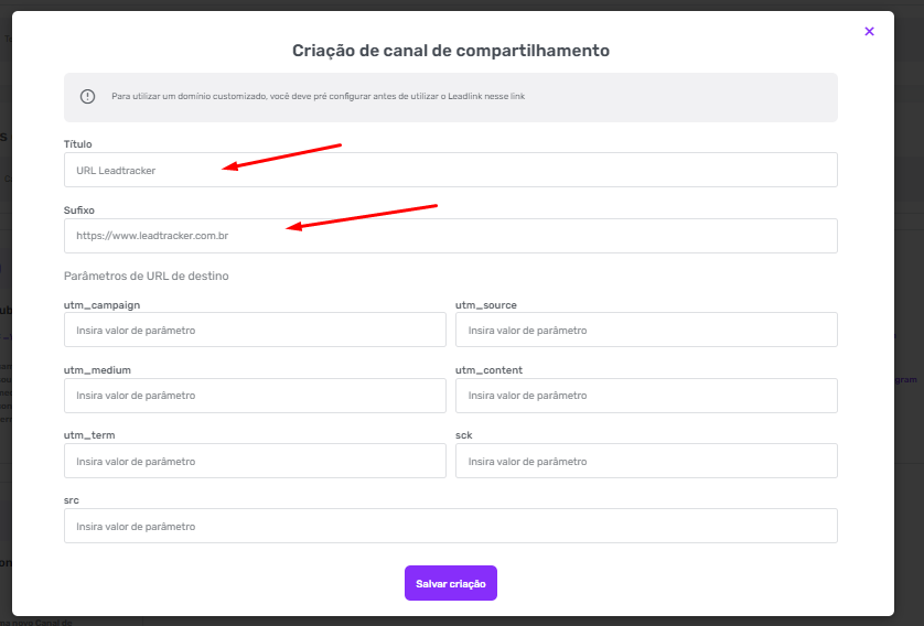 5º Passo: Após clicar em criar novo, abrirá uma nova joanela similar ao de criar um leadlink. Você poderá dar um título ao seu canal personalizado, adicionar o sufixo desse canal (ex: "bio", "telegram", "stories") e parametrizar essa URL com as UTMs, SCR e SCK desejadas.