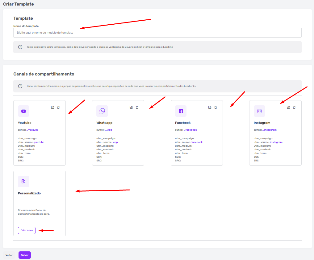 4º Passo: Escreva um nome para o seu Template. Em seguida, você verá os canais de compartilhamento que nosso painel já disponibiliza: Youtube, WhatsApp, Facebook e Instagram. Você só irá precisar adicionar neles as UTMs, SCR e SCK desejadas. Caso queira criar novos canais personalizados, basta clicar no botão “Criar novo”.
