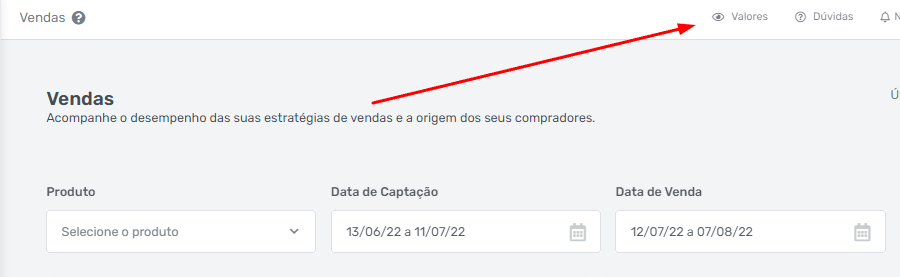 Para visualizar estes valores, basta clicar no ícone "Valores" na barra superior do seu painel Lead Tracker (imagem abaixo).